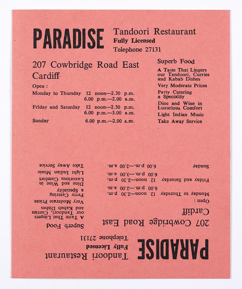 Bill 'Light of India Tandoor Restaurant', Whitchurch, Cardiff. Handwritten order details on the back. Stamped with date 12 August 1982.