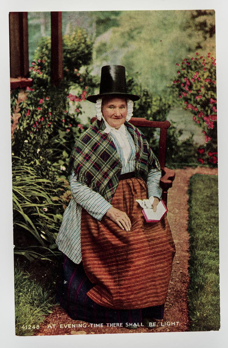 Postcards such as this popularised the image of the Welsh costume. Thousands were produced as souvenirs. They showed the Welsh lady drinking tea, reading the Bible or spinning outside her cottage. The aim was to portray Wales as a welcoming and wholesome place. Postcards contributed to the Welsh costume becoming a national icon.
