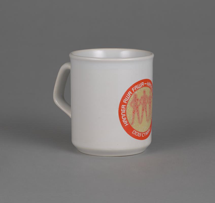 circular badge 'BBC CYMRU' and picture of three people printed on cardboard and coated with plastic, attached to metal back and safety pin