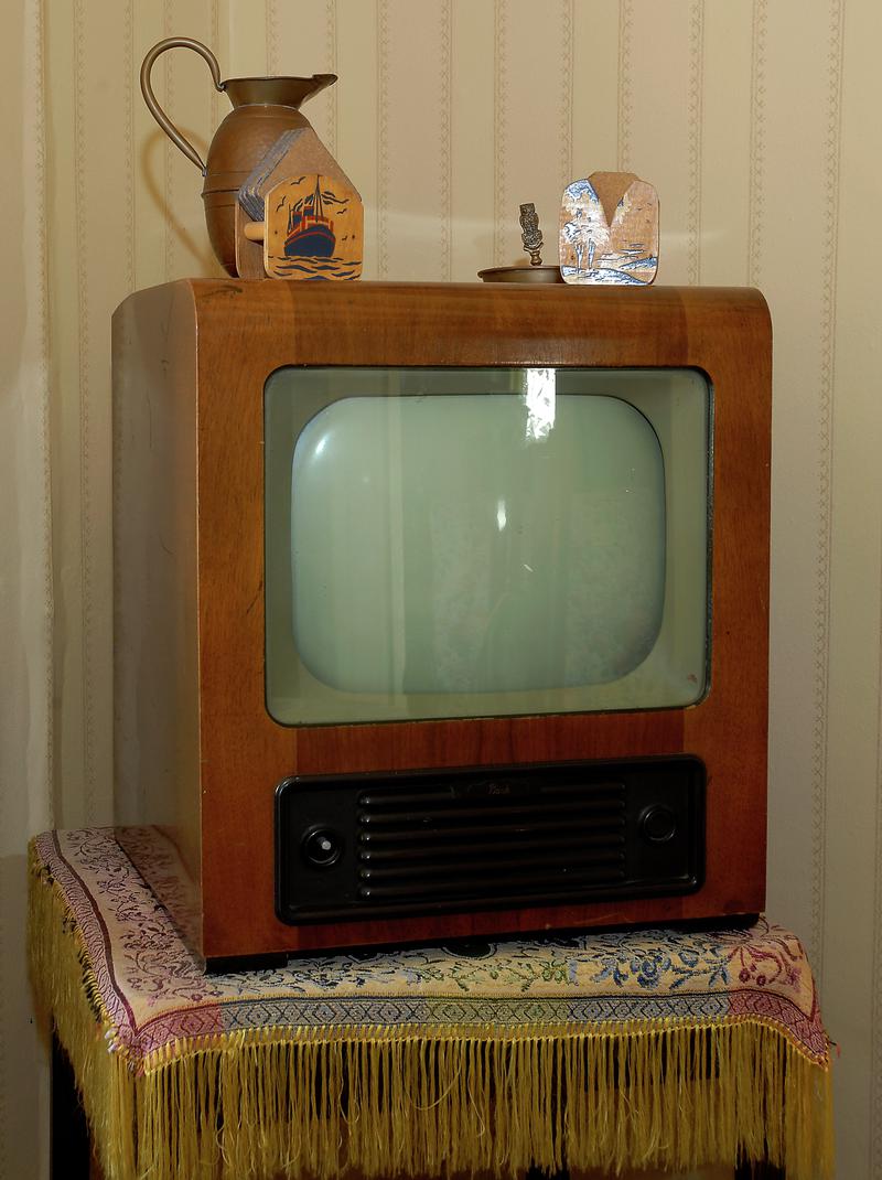 Bullseye optic perspex magnifying lens attached to oak stand by two knurled bakelite knobs which can be adjusted to vary the height of the lens; placed in the front of television screen to magnify the picture.