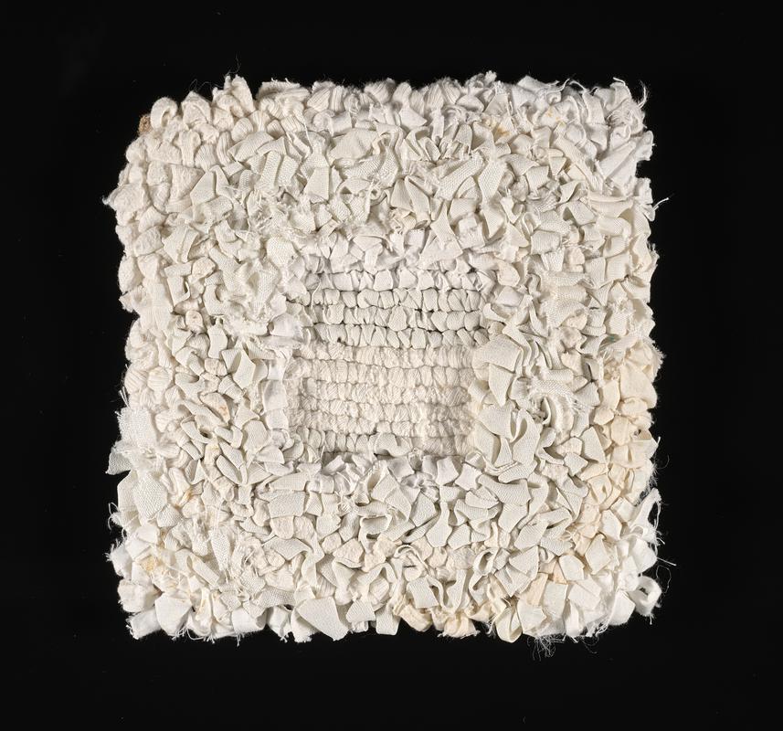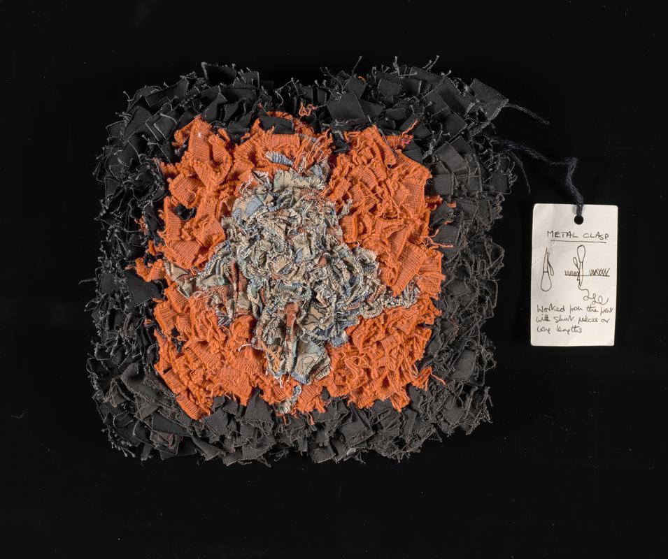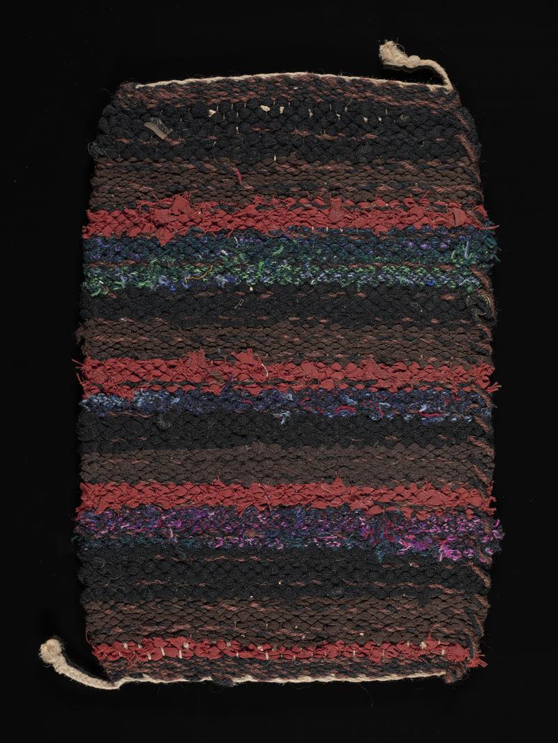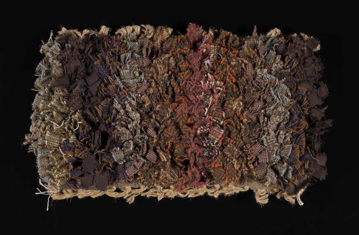 Rag rug sampler (prodded) made on hessian back. Tufts made from various thick woollen plain and tweed rags.