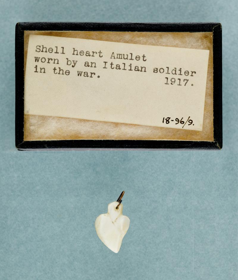 Amulet in a box, with a typed note: 'African Bean Amulet carried by private of Royal West Surrey Regiment. 1916'. Acquired by the Museum in 1918 from Edward Lovett, a folklorist and collector from Croydon. The bean is capped with a yellow/cream coloured substance. It is not clear whether that is part of the plant or a medium into which the brass suspension ring could be anchored. Oval shape, slightly flattened at front and back.