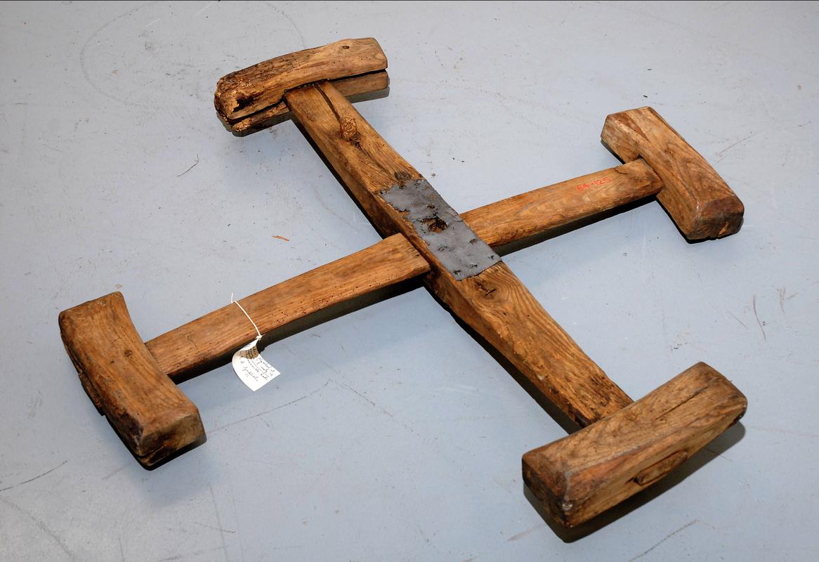 Cast-iron stamped T. Jones, Carmarthen, H-shaped base holding 4" diam. cog (horizontal) and 22" diam. cog (vertical). On the base are mounted 2 U-shaped brackets at right angles to each other to hold driving cog (41" diam, horizontal) and vertical shaft. To the latter is attached the superstructure which takes the wooden shafts (missing) to which two horses are harnessed; and at right angles to the shafts are two sockets (on the superstructure) to take stays and leading rods (both missing) to hold horses' heads. [accession / catalogue card]