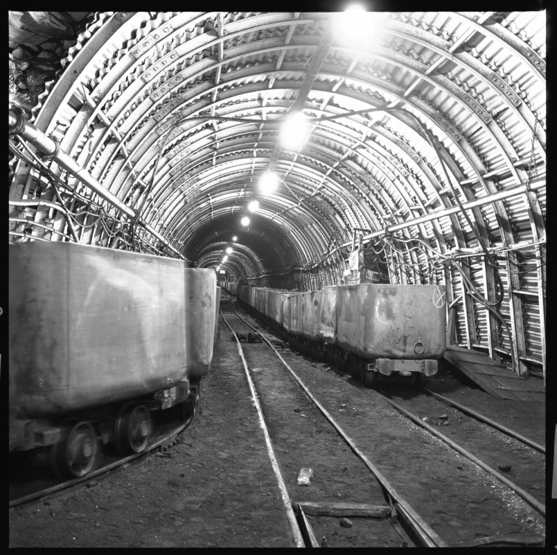Negatif ffilm du a gwyn yn dangos gwaelod y pwll yng Nglofa Garw.