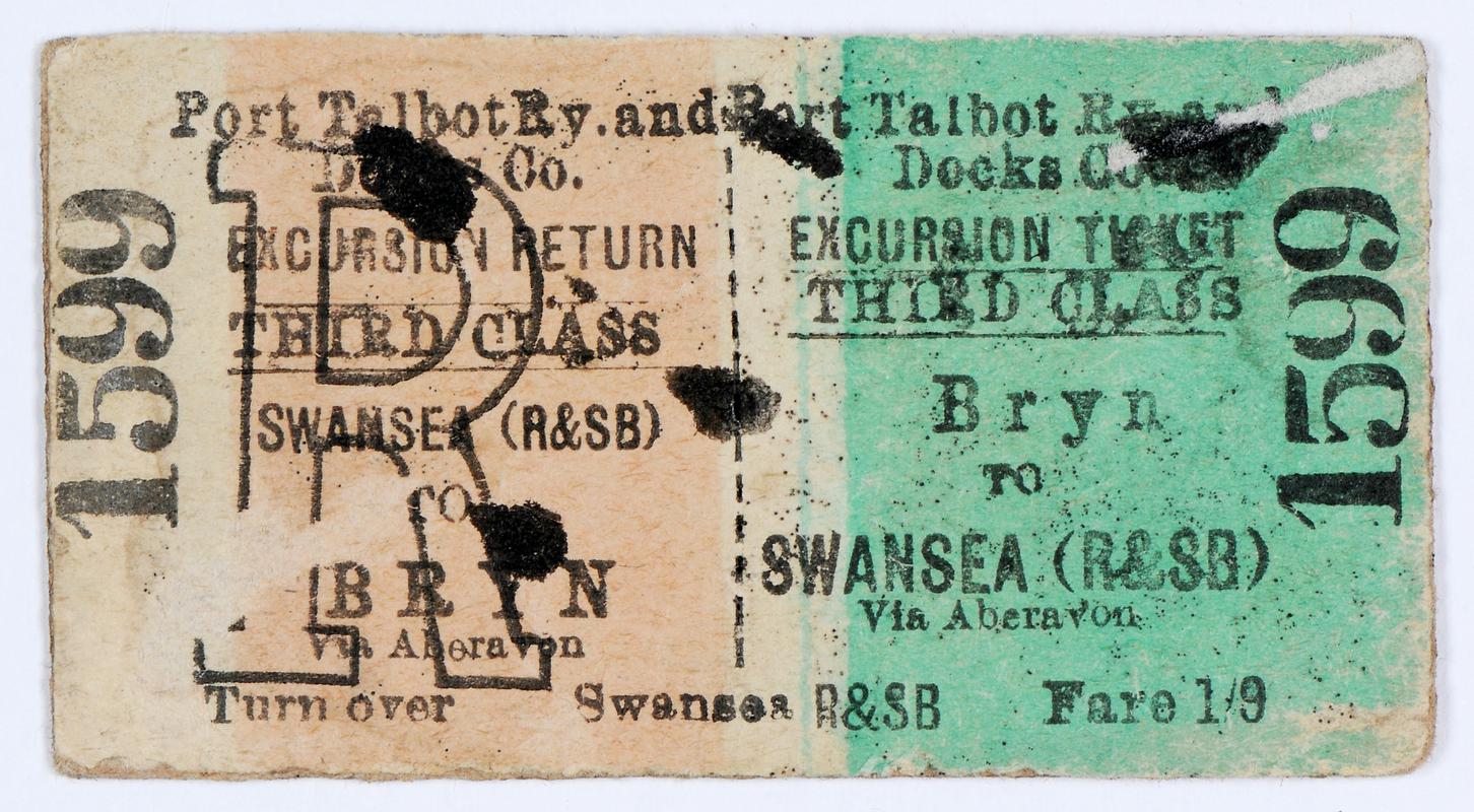 Yellow card with black print. Port Talbot Ry. & Docks Co. third class excursion return ticket, Swansea to Bryn, number 699, fare 2/0.