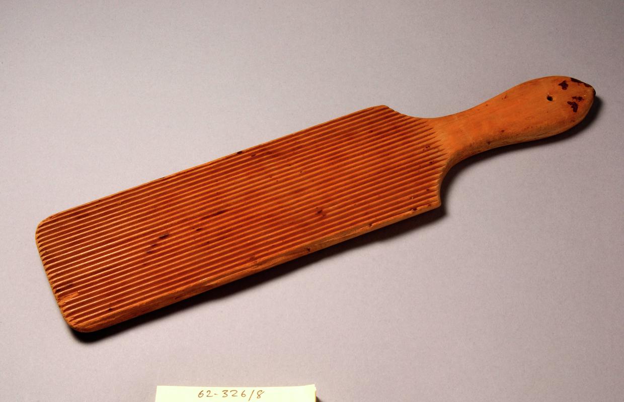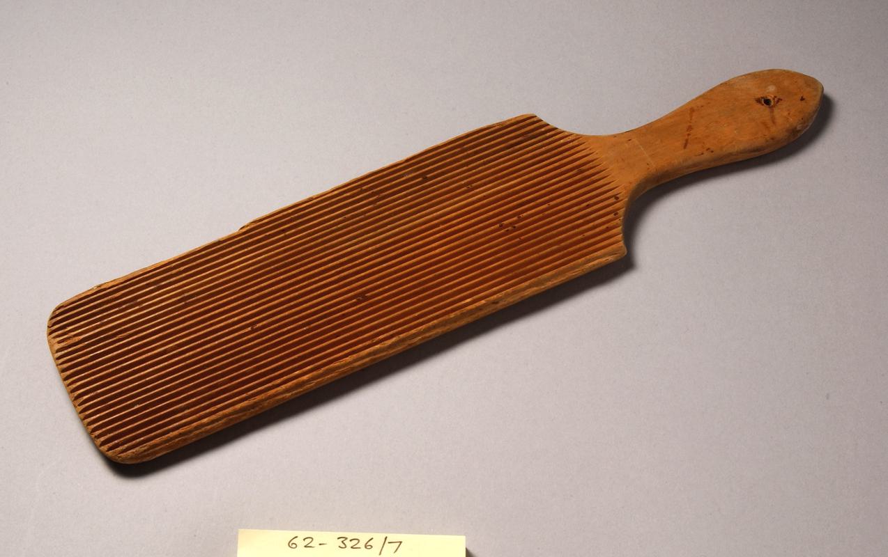Screw type cheese press. Wooden trough on four splayed legs with four butt handles at each corner of trough. Circular chanelling carved into trough for embedding vat, also with draining hole. Two circular section vertical posts joined with two parallel horizontal bars at top. Metal plate attached to a long vertical screw and operated by a handle fixed above lower vertical bar.