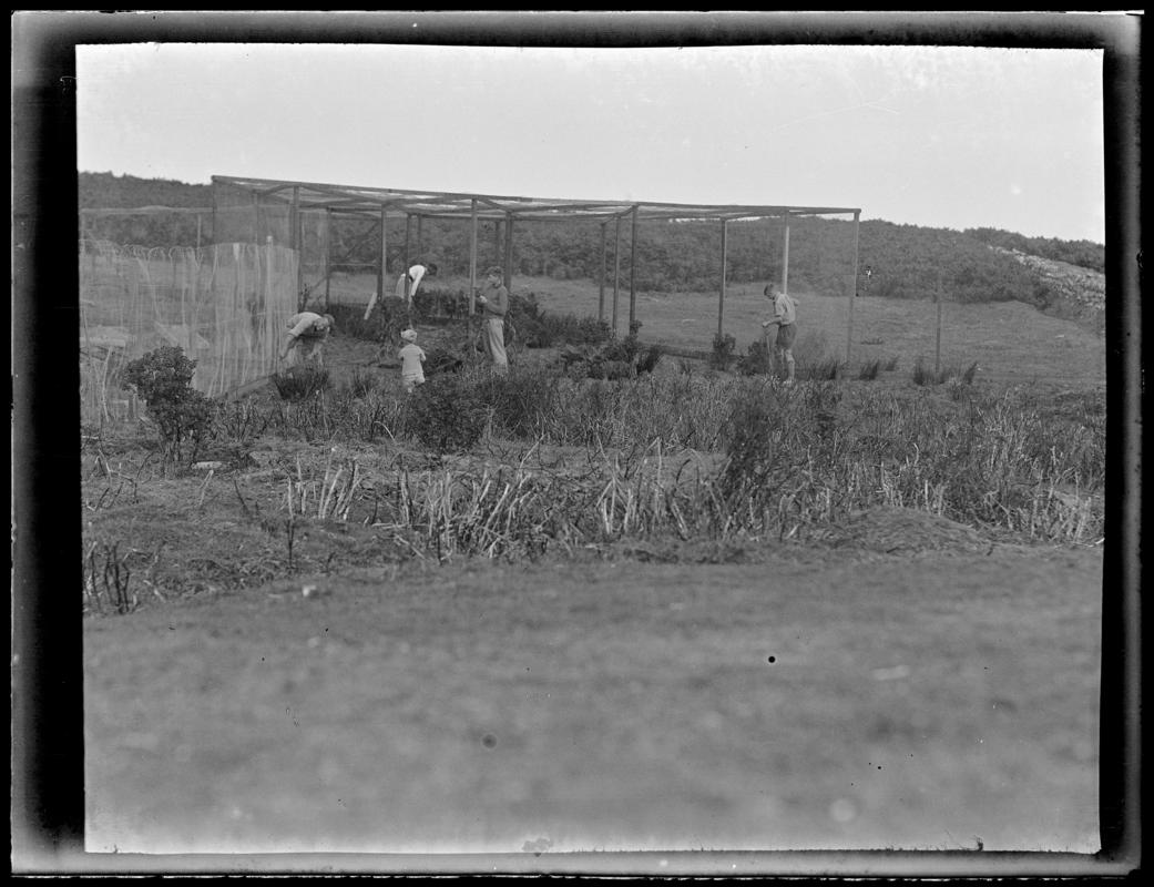 Two young Sparrowhawks (Accipiter nisus) on branch near the reservoir in Woods Covert, Cardiff. Photographed 13 July, 1912.