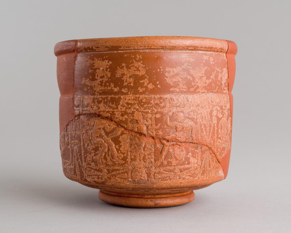 A panelled bowl with the ring-tongued ovolo Rogers B107. One panel has a double medallion with a Cupid and a narrow panel has a column. Both appear elsewhere on stamped bowls of Albucius.