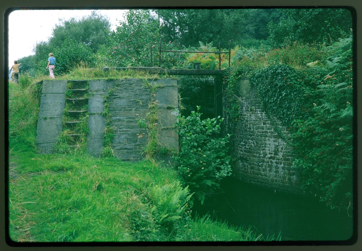 Group of children on banks of River Tawe (on right) at southern end of Pontardawe Steel Works slag tips from the south west.