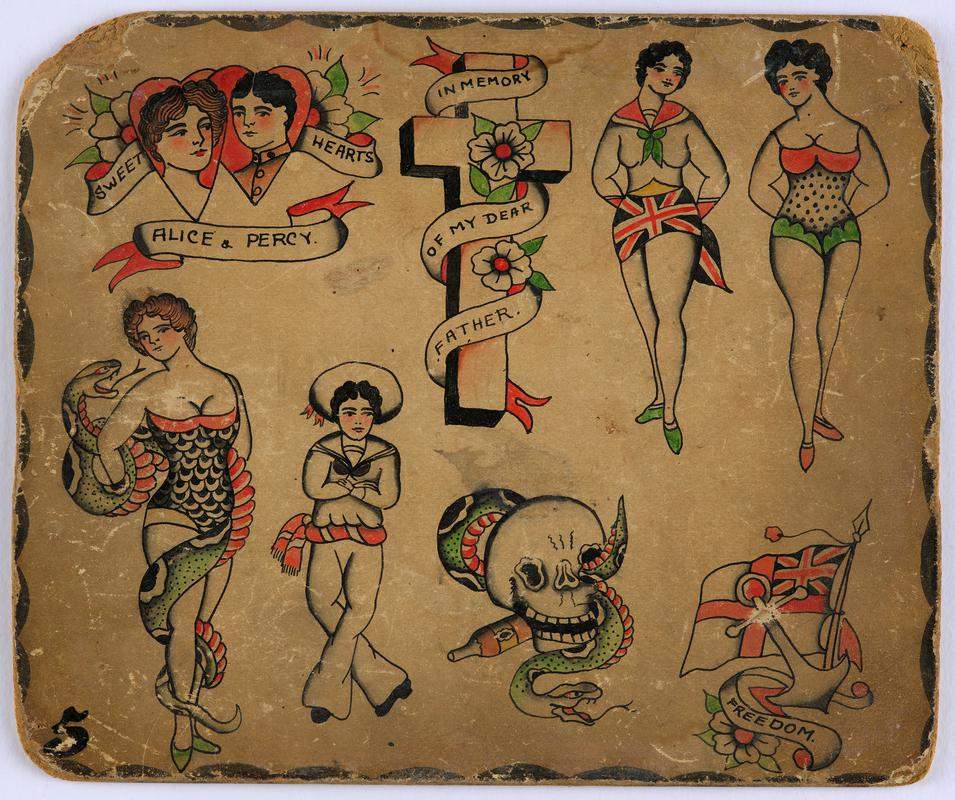 Tattoo transfers on a large sheet, including a bull and matador