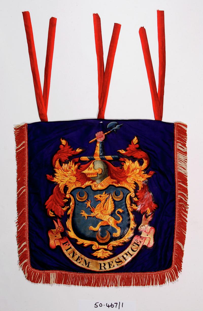 Wooden cabinet. Bottom half comprising two drawers and cupboard, with bookcase with two glass doors on top. Bolt type lock on the front of the glass doors. Bookcase and bottom section separate. Small metal plaque on the top of the cupboard.