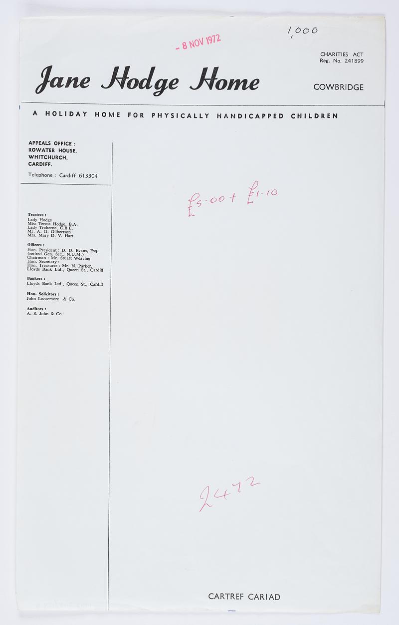 Blue and red print on white paper with date typed in black. Dated 7th January 1987. Letterhead cut from original letter.