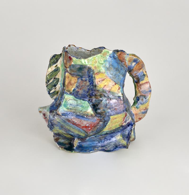 Bottle vase, stoneware, thick tapered foot ring, broadly square upright body shaved to form 16 vertical facets of varying width, faceted horizontally round the shoulder, narrow neck with outturned lip, speckled brown salt glaze covered with a blue cobalt slip.