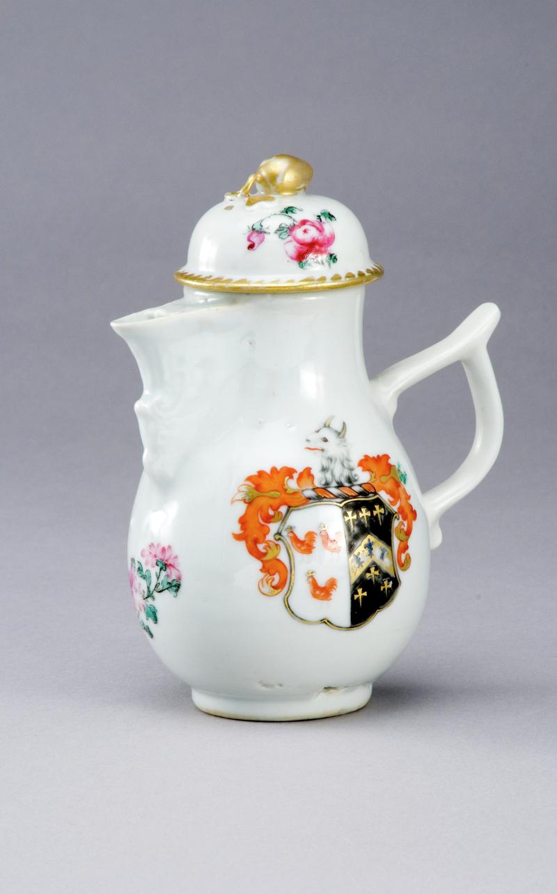 Saucer, hard-paste porcelain, circular, footring; the footring is banded with three lines in underglaze blue, the underside of the footring is painted with a flower in underglaze blue that is circled with a line in underglaze blue, the outer side is painted with three small flowers in gold and red and two large fans in underglaze blue and red overpainted with gold, the centre is painted with a gold and red flower banded by a thick border in underglaze blue and red, the inner side is painted with two large flower spays and two fans in underglaze blue and red overpainted with gold.