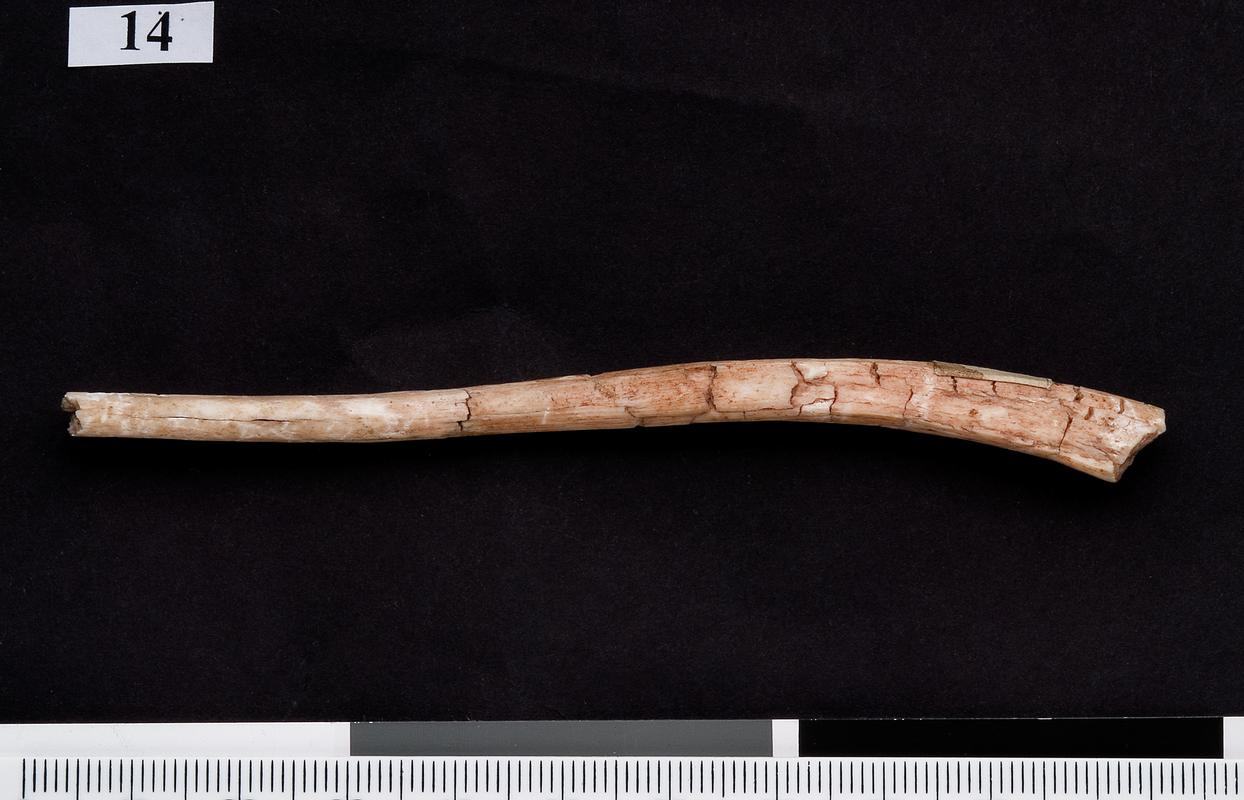 Fragment of a bone pin of circular cross section which tapers to a fine point. Show some evidence of burning so probably went through the pyre.