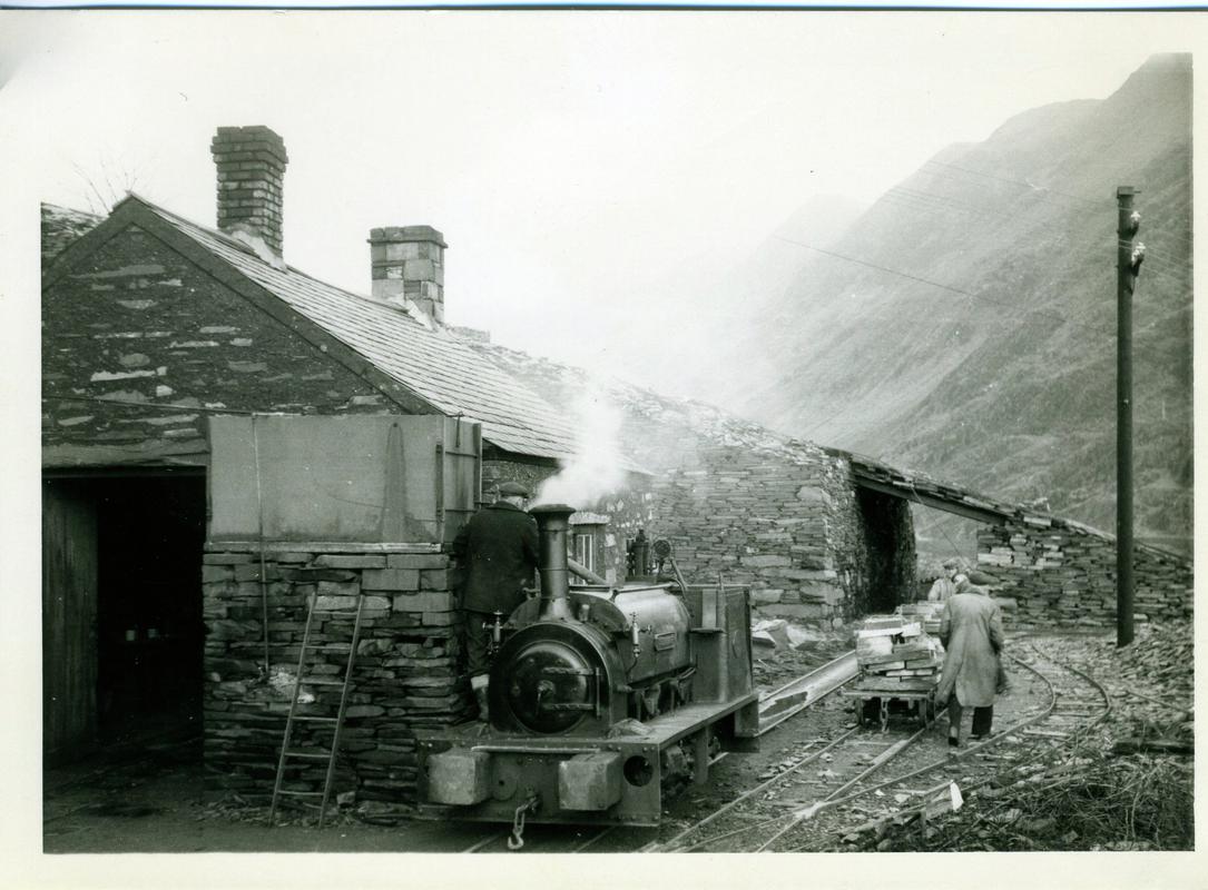 Photograph of three people outside the Engineer’s House at Gilfach Ddu (now home of the National Slate Museum).