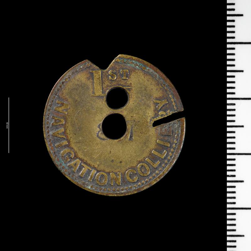 Circular check with V shape and slit cut out of edge, two holes for attachment, inscription on obverse and letter"A" stamped on reverse