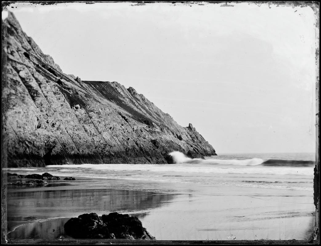 Salted paper print. Entrance to cave with pool at Three Cliffs Bay. Mounted on card.