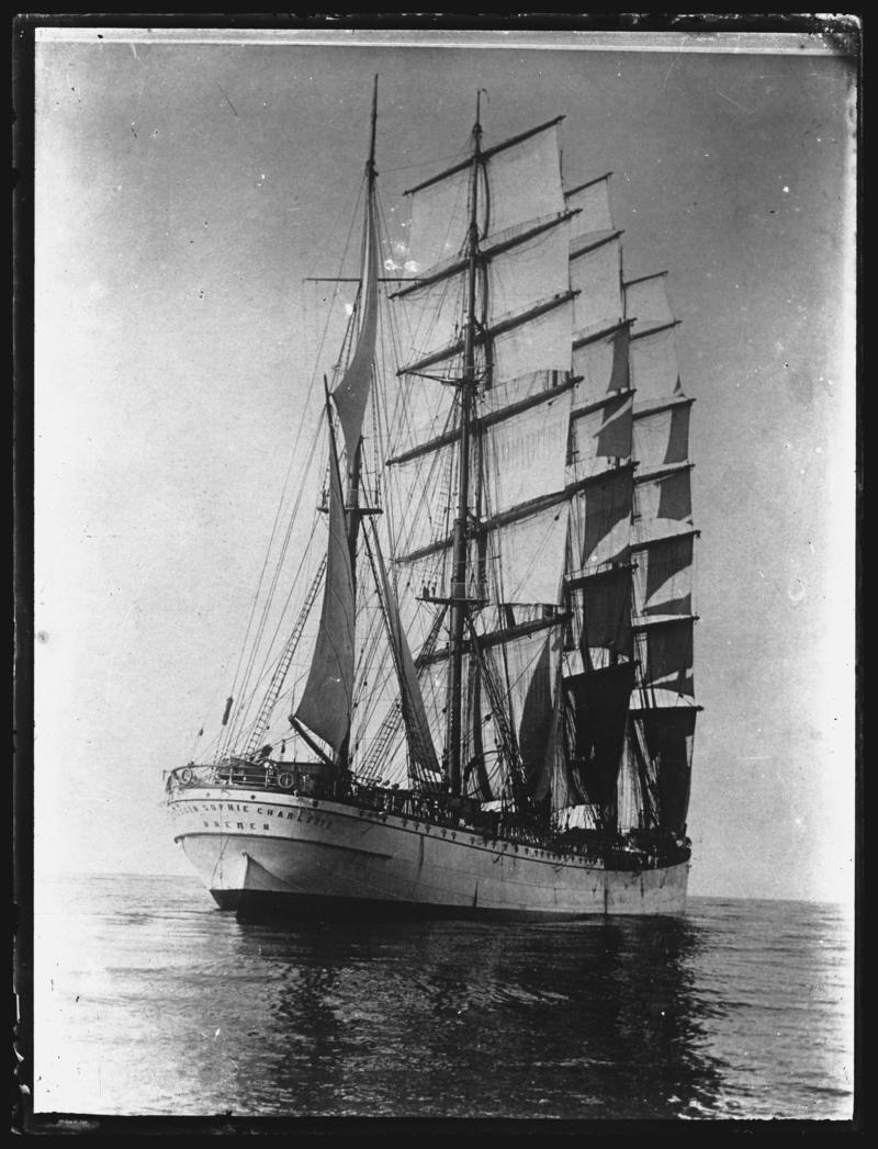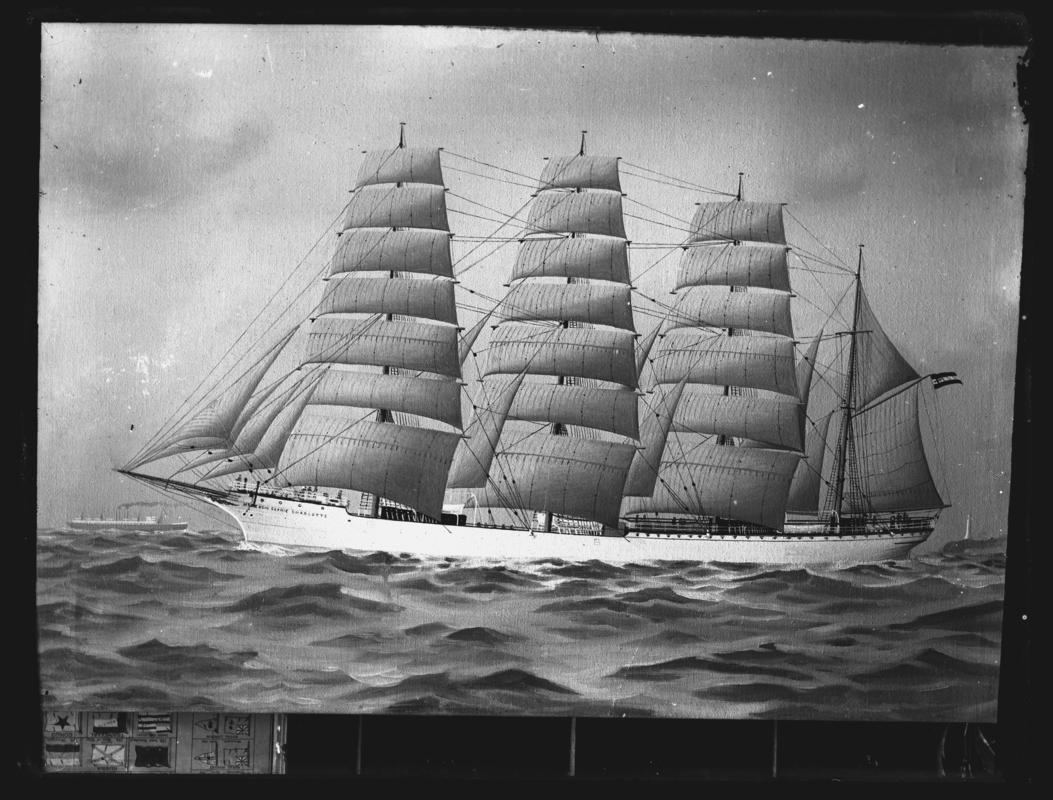 Photograph of a painting showing a port broadside view of the five-masted ship PRUESSEN.