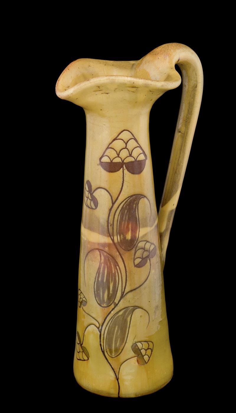 Vase, earthenware, elongated ovoid shape on a flat base, narrow neck that flares out at the rim which is oval with side indentations from where the loop handles are moulded and that terminate at the neck; decorated with a brown glaze, the front of the vase is decorated with Hebrew characters that read 'Rebekah'.