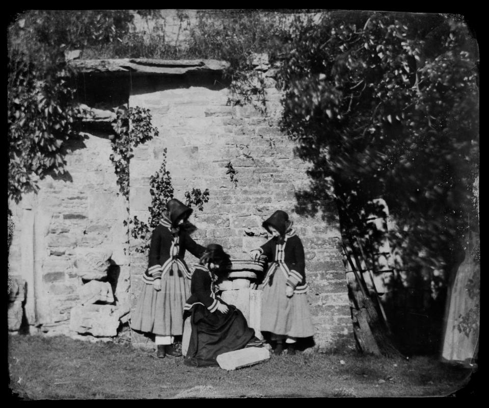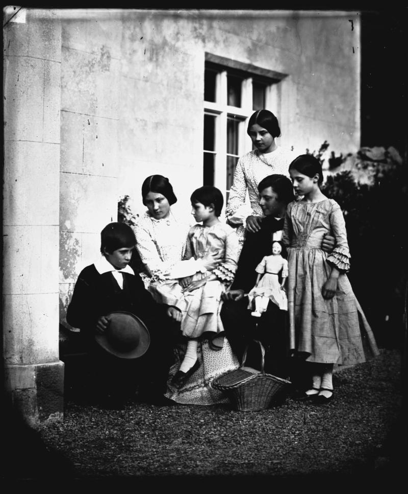 Salted paper print. Group photograph of the Llewelyn family, containing eight people.