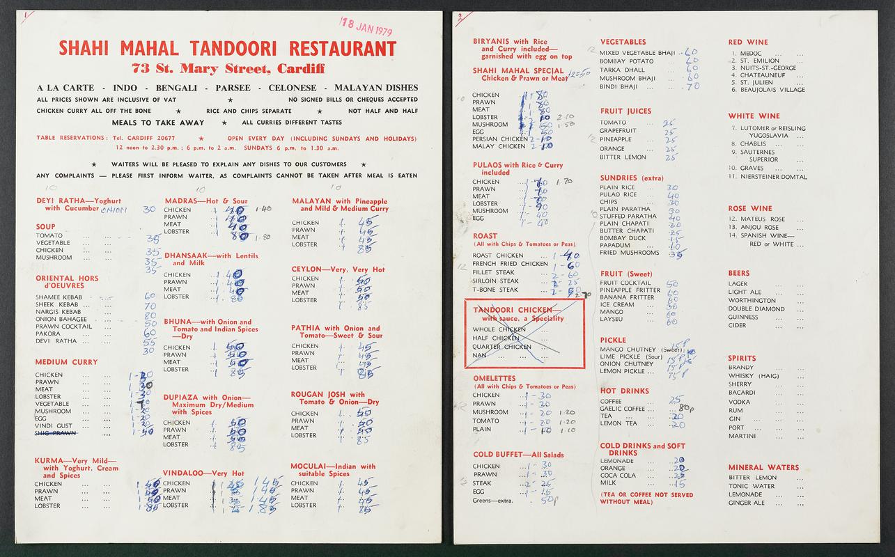 1987 calendar 'The Raj of India Tandoori Restaurant', Llantrisant. Handwritten order details on the front. Stamped with date 12 November 1986.