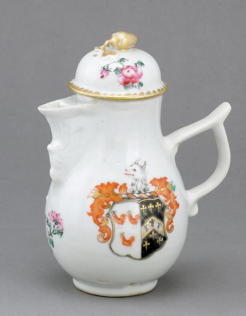 Hot water jug, standing on an applied spreading foot with beaded rim and short stem, raised baluster-shaped body, long up-curved pouring spout, grooved and with a shell motif at the bottom, above an engraved monogram, JEP, a wreath below; ear-shaped strap handle bound with wicker and with heart-shaped terminals; stepped domed cover, with beaded rim and cast acorn finial, hinged from the cover.