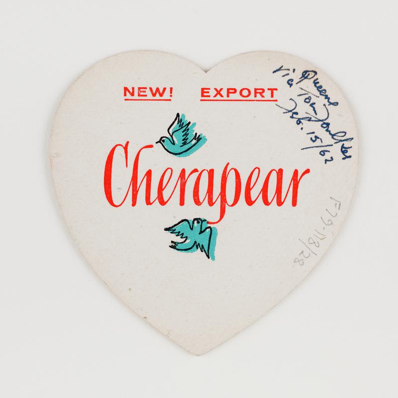 Double cigarette vending machine painted red with inscription 'Cigarettes' in white on both sides. Front panel also red with glazed section. Coin slot at the top (2d and 6d), reject coin tray drawer below, and enamelled labels in the form of cigarette packets (Woodbines and Players Navy Cut).