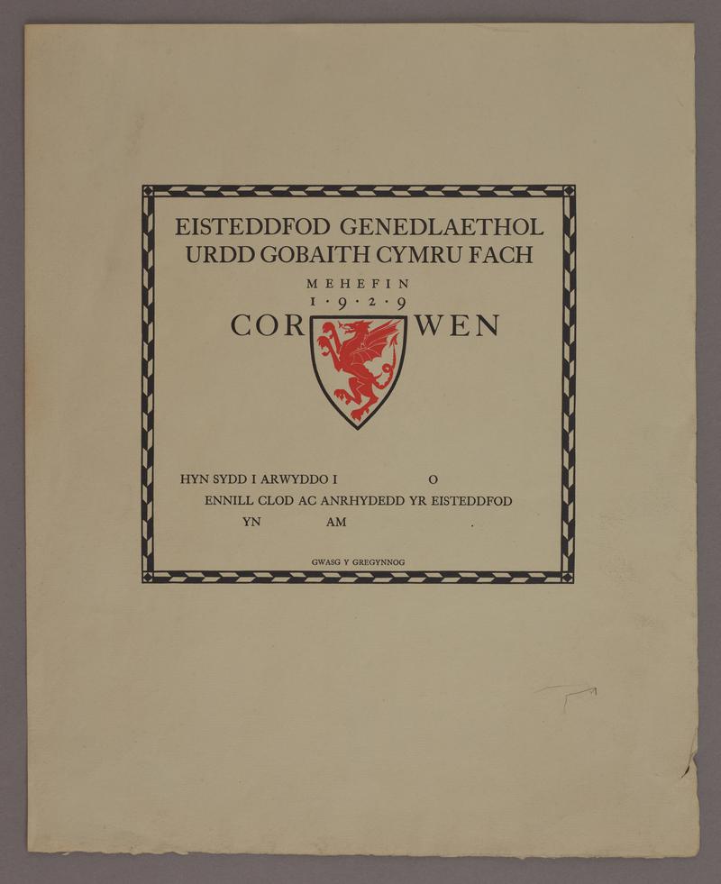 The title page, coloured green, bears scribal decorations in white, together with the following scribal inscription in black 'Urdd Gobaith Cymru. Cymru Cyd-Ddyn Crist. Tystysgrif Aelod Adran. Swyddfa'r Urdd Aberystwyth'.