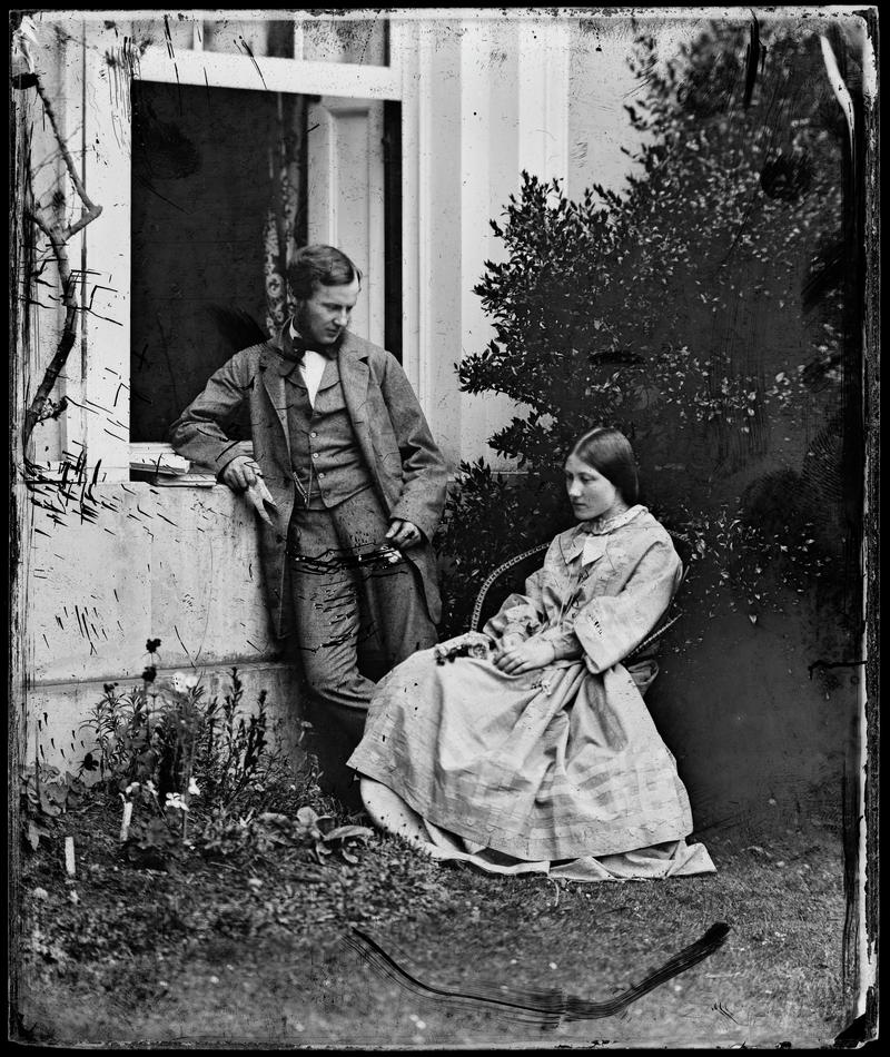 Waxed calotype negative with tab at each corner. Ivy covered tree, iron railings at left.