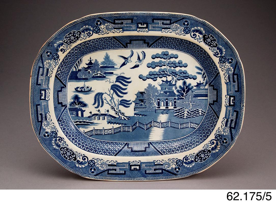 An oval meat dish manufactured from earthenware decorated with the Willow pattern in blue transfer print. Setter marks are visible on the front and back.