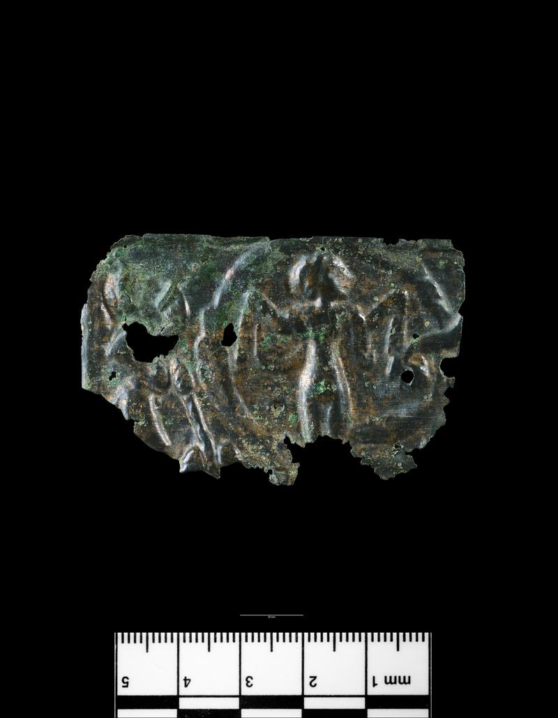 A large part of a thin copper alloy sheet which had been folded into a narrow strip before being discarded. This treatment, and the cuts which were necessary to unfold it, has resulted in some loss of detail. The larger portion is decorated with two aediculae placed side by side but on slightly differing alignments, the one depicting Mercury within, the other Mars. Below the aediculae are three smaller, oval panels, each with the head in profile of an elaborately helmeted deity, Mars or Minerva. Two further such panels occur above, and impinge upon the aediculae. The smaller portion has a single aedicula of the same die as that with the figure of Mercury on the larger piece. There are two oval panels each impinging on the aedicula, one above and one below. 3rd-4th century A.D.