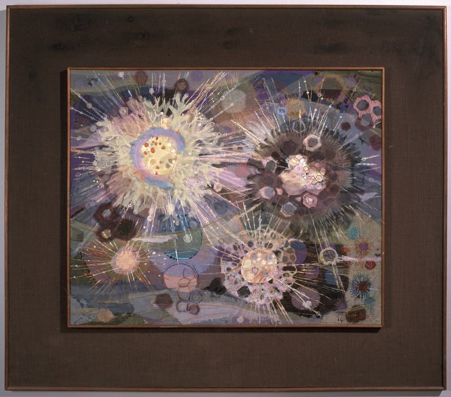 Silk embroidered with coloured silks in satin, long and short and split stitches. Oval shape and filled with honeysuckle, sunflower and other flowers growing from a two-handled vase. On the paper backing is the following written inscription: "Mary Gittins Rayton / Oswestry near Salop/ 1794”.