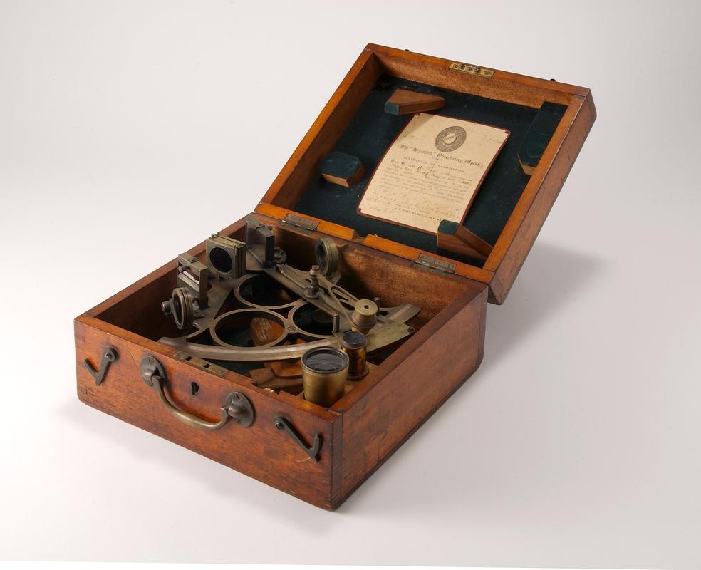 Leather case for portable saw. Flap lid attaches to brass stud, inside are compartments for handles and tools, on rear are two straps for attaching to belt.