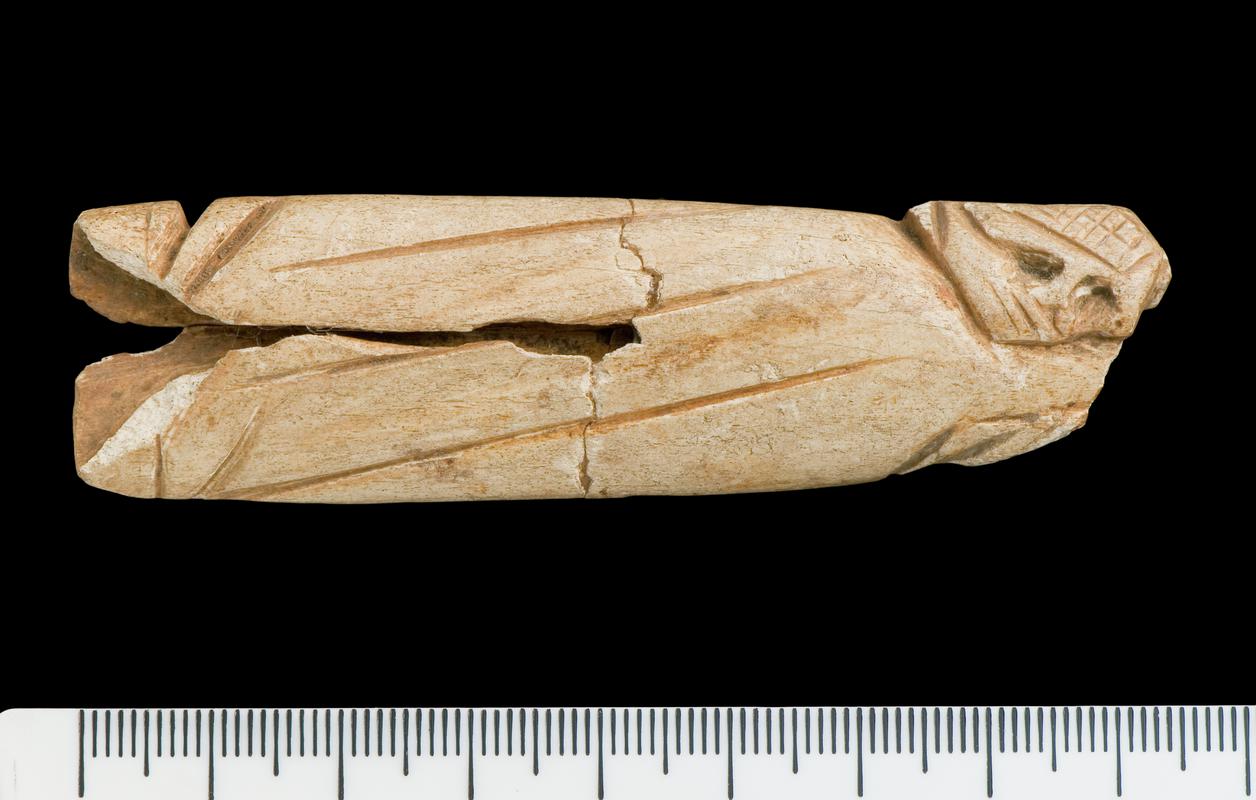 Length of bone, tapered to form a neck at one end. Signs of gnawing