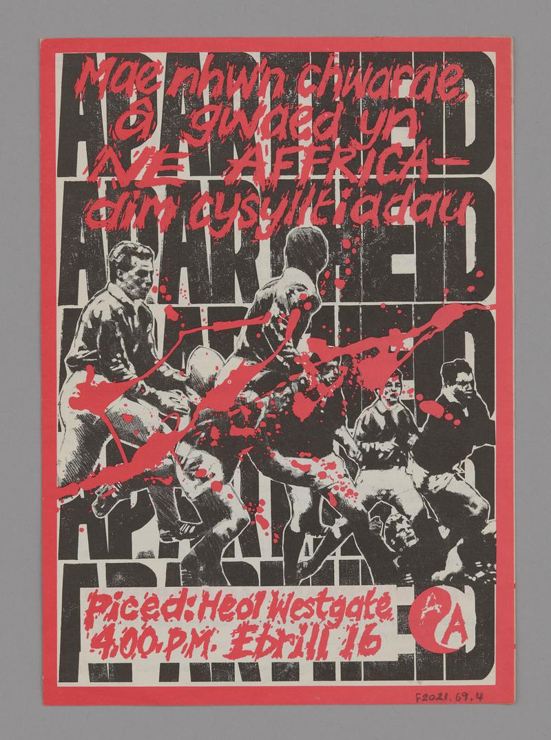 Poster designed by Anthony Evans for the Wales Anti-Apartheid Movement (WAAM). The poster advertises evening performances of song, dance and poetry held in Cardiff (Students Union), Swansea (Students Union) and Treorchy (Parc and Dare Hall). Inscribed: 'AMANDLA / CULTURAL ENSEMBLE / SONG DANCE POETRY / OF THE OPPRESSED PEOPLE / OF SOUTH AFRICA'.