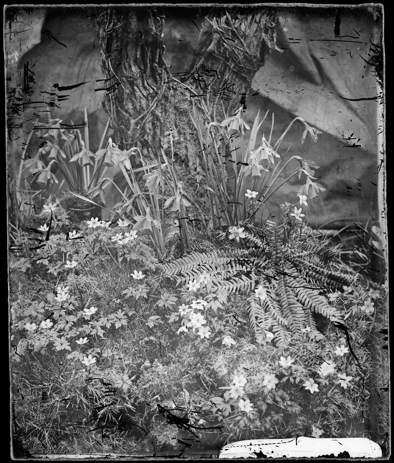 Collodion glass negative showing ferns and dafodills in natural setting.