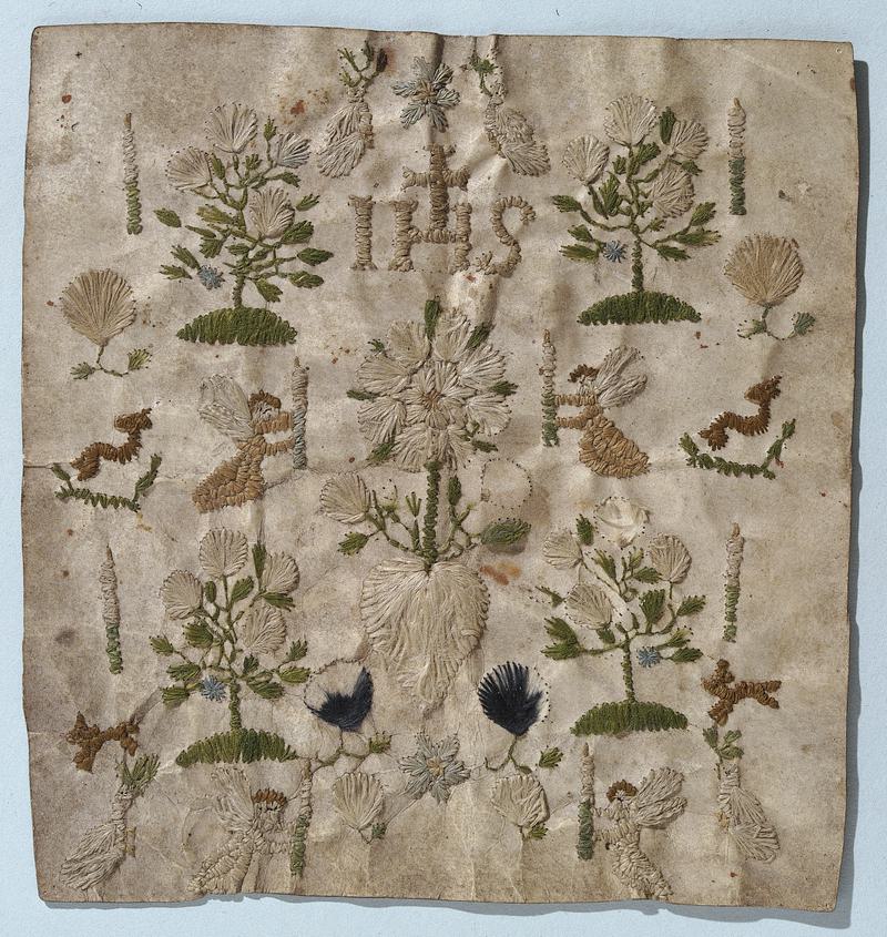 One of a set of nine bed curtains and valances (40.433.1-9) from Plas Llanfair, Llanfair-is-gaer. Coloured crewelwork embroidery.