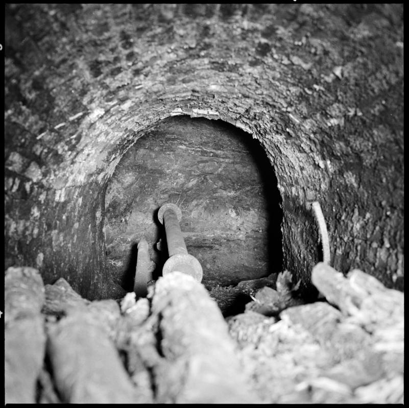 Black and white film negative showing Gullick Dobson powered supports, underground at Betws Mine.