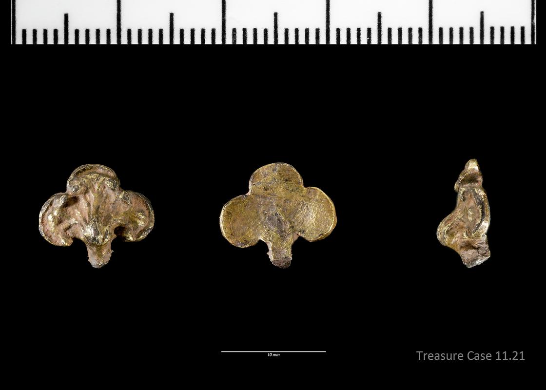 Incomplete composite silver-gilt dress-hook (hook missing) with a lozenge-shaped back, to which rope-twist filigree decoration had been soldered (3-strand filigree wire) bordered by three circlets and granulated pellets in the corners, and 3 circlets on the four hollow, hemisperical bosses. There is one surviving large pellet at the end of one of the straight filigree strands. There is a central perforation for a decorative knop, probably a flower head, which is now missing. There are two punched or engraved amarks (11?) on the reverse from the manufacturing process for the plate. Gilding does not extend to the back. There is a split along one of the punched lines beneath the former location of a strand of filigree, and no evident traces of attchment point for the hook (unless it was in one with the central knop stem).
