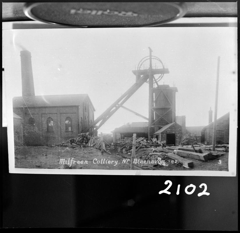 Black and white film negative of a photograph showing a general view of Milfaen Colliery, near Blaenavon. 'Milfraen' is transcribed from original negative bag.
