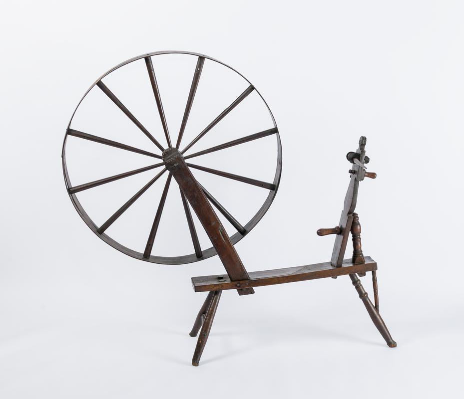Welsh wheel, diam. 41". Three legged with split front leg. One leather and one wooden bearing for spindle.
