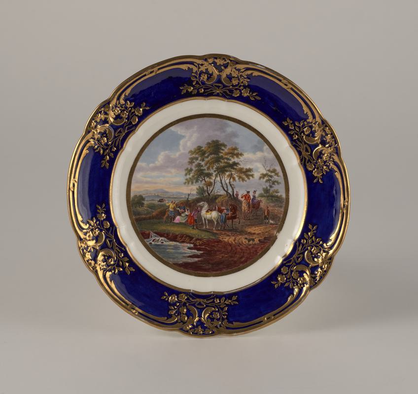 Dish, round, soft-paste porcelain with a buff translucency; standing on a cylindrical foot rim curving into rounded spreading sides and flared lip; eight lobed lip, and cruciform moulding; painted with a border of four groups of convolvuli and leaves, in pale blue, pink, yellow, and green enamels, and a small convolvuli spray in the centre; gilt leaf and dot border inside the lip.