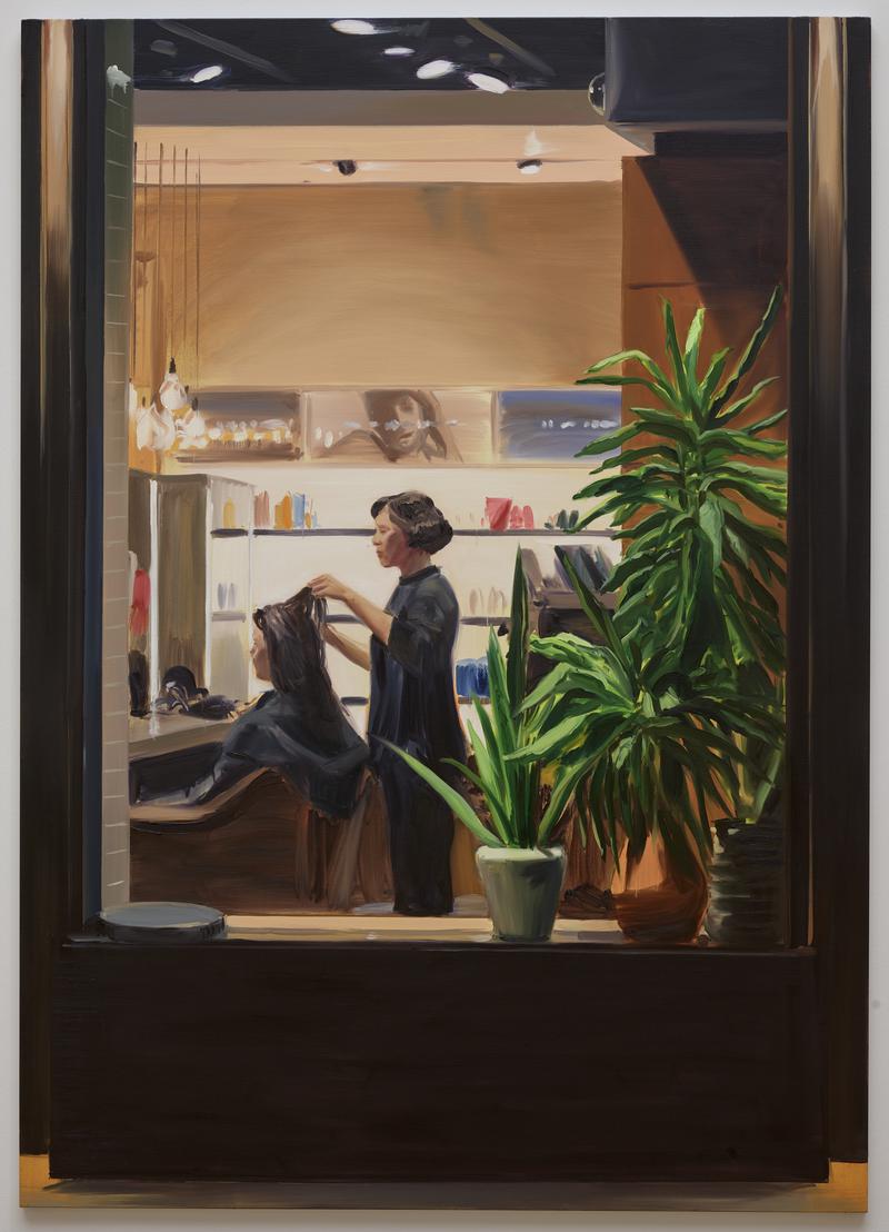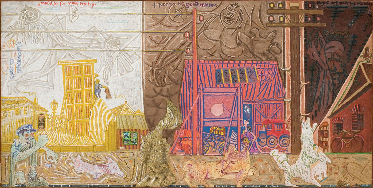 Kidney-shaped dish, white earthenware with clear glaze, the middle section of the upper and lower edges scalloped, plain rim, kidney-shaped foot-ring; the dish is transfer-printed with the 'Greenfingers' pattern, under the glaze in polychrome colours with three vignettes, at the left side of the dish is a scene with a man and woman in typical 1950s costume beneath a trailing tree in a flower garden, the woman is bending down to pick a flower and the man is standing, holding a shovel and smoking a pipe, at the centre-bottom edge of the plate is a second vignette, composed of a watering can and garden shears amid flowers, the third vignette is at the right side of the plate and comprises a woman with full skirt, raking or hoeing a flower bed.
