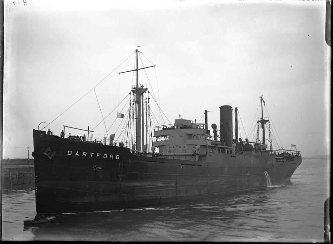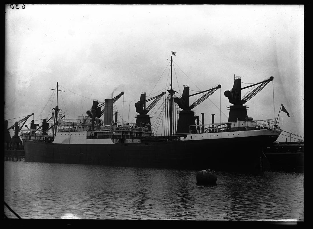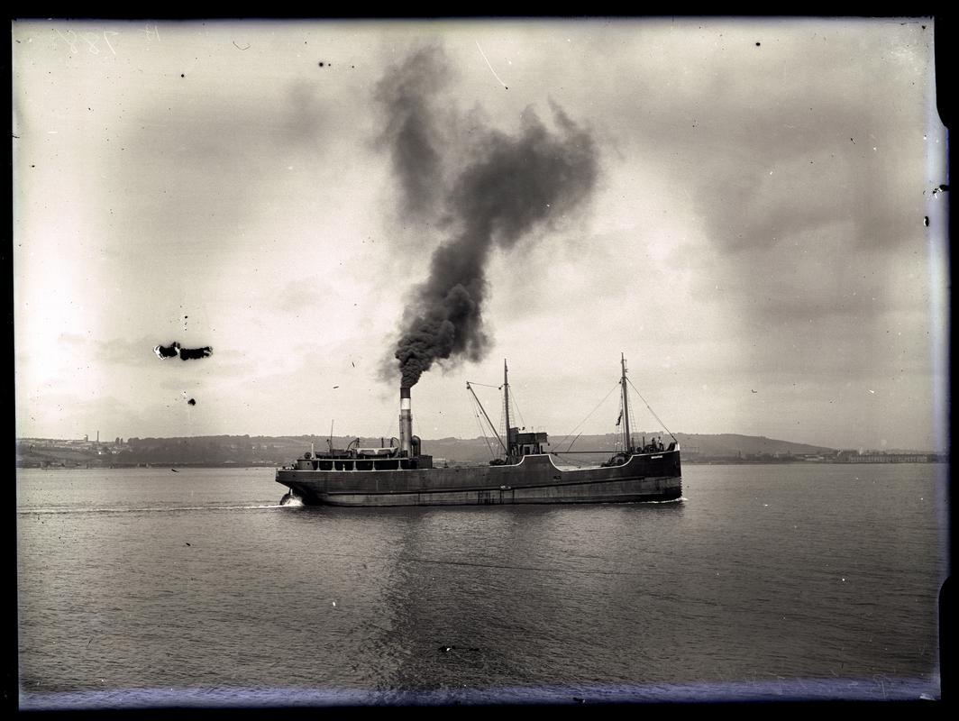 Starboard broadside view of S.S. BARON MACLAY and tug, entering Cardiff, c.1936.