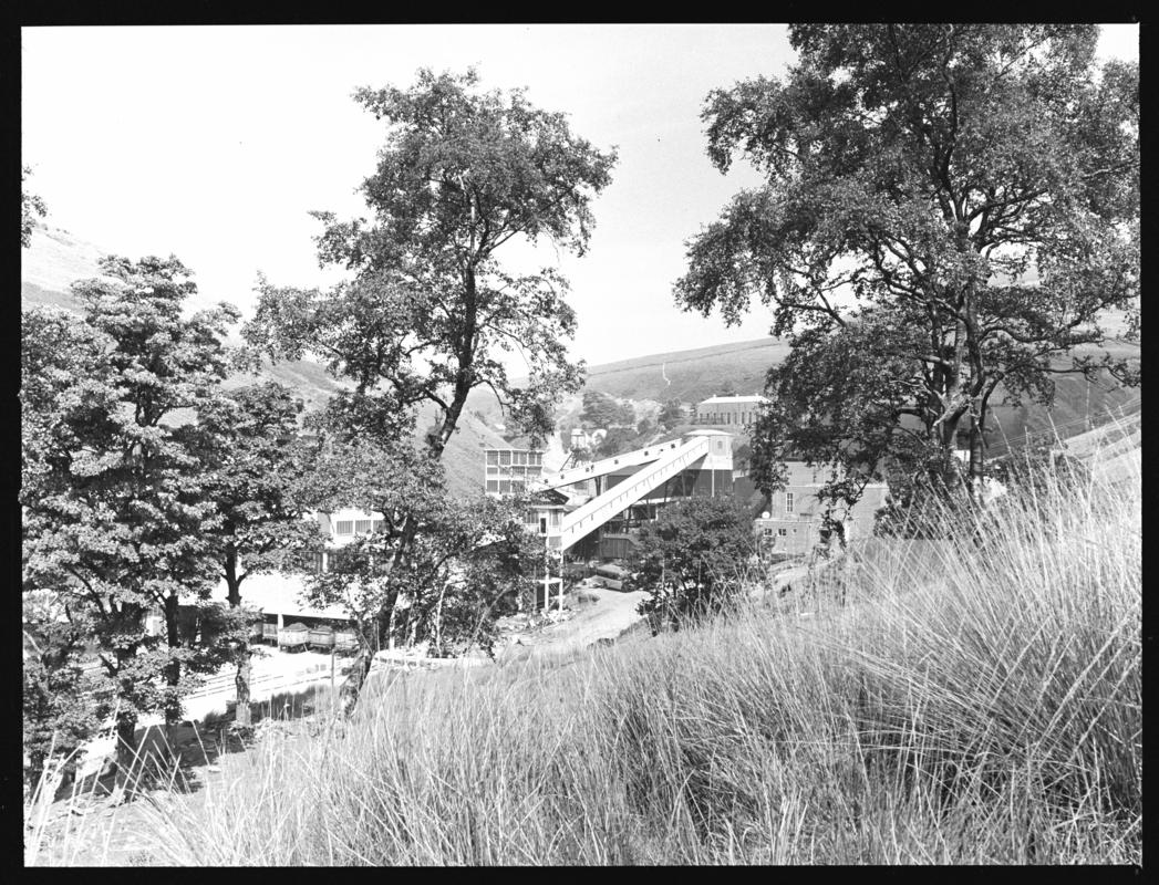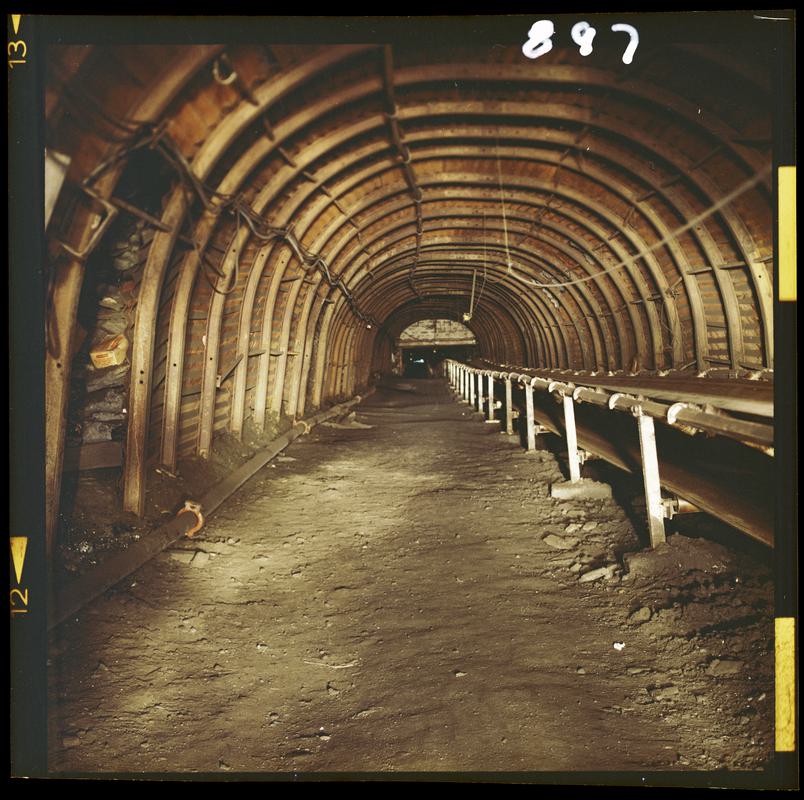 Black and white film negative showing an underground coal transfer point, Brynlliw Colliery.