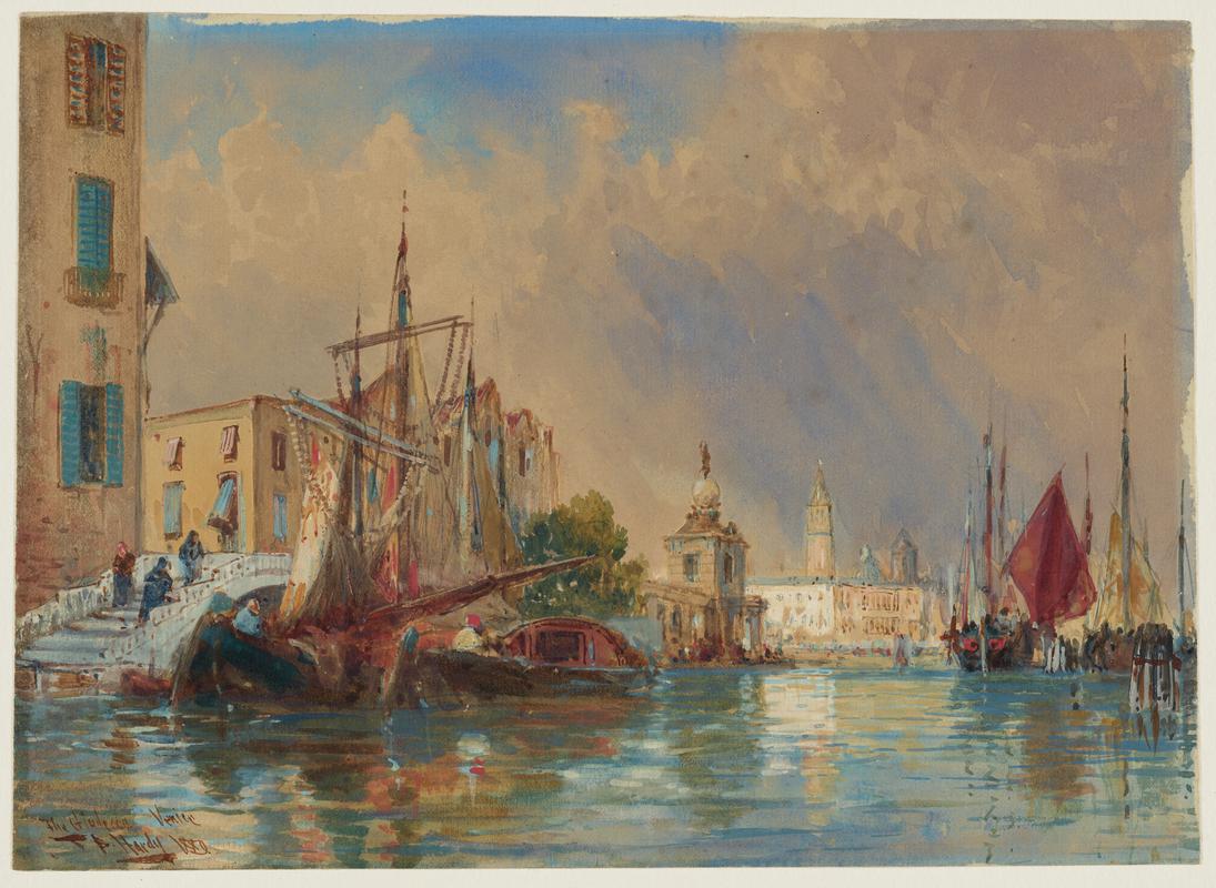 From a viewpoint on the Molo, this composition depicts shipping on the Giudecca Canal, the Dogana, Santa Maria della Salute, the mouth of the Grand Canal, the Giardinetti Reali and the facade of Sansovino's Zecca. During his visit to Venice, Boudin noticed how: '..a storm wraps everything in a grey and dull mist...the waters, which don't resemble those of the Mediterranean, are mostly green and do not differ from the waters of the Channel.' Gwendoline Davies purchased this work in Paris in 1912.