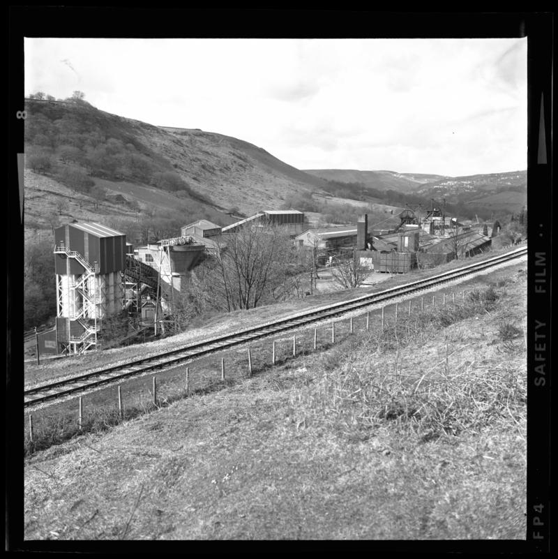 Black and white film negative showing housing at Nantymoel with the headgear of Western Colliery in the background. 15 April 1980.
