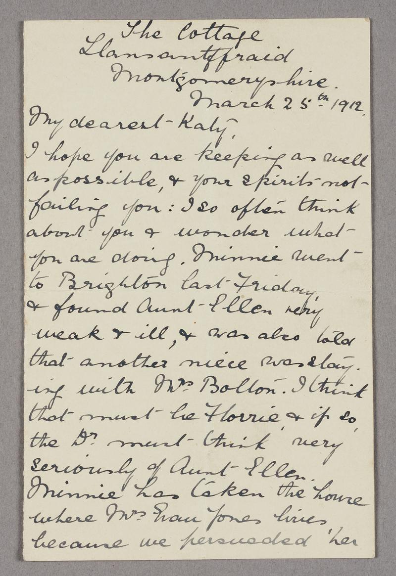 Kate Williams Evans, born in Montgomeryshire in 1866, was sentenced to 2 months hard labour for malicious damage, having smashed a window in a government building in London. She served 54 days in Holloway Prison in March-April 1912, during which she went on hunger strike. after returning to Montgomeryshire later that year, Kate was active in the Women's Freedom League.