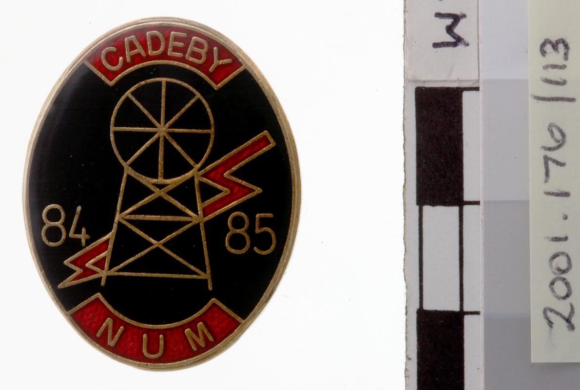 Gold coloured metal badge with design set in black enamel with inscription set in red enamel. Clasp attachment on reverse.